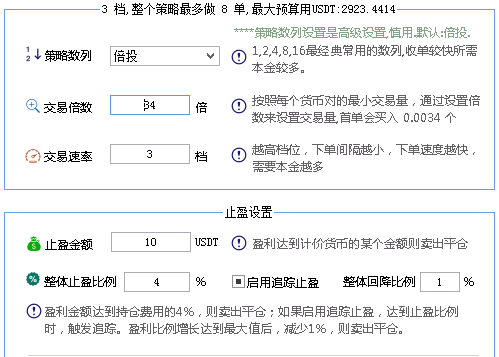 根据每个品种的买卖深度对比、搜索系数和K线震荡指数,实时云计算得出每个策略组的买入条件和买入间隔!当报价在若干个时间周期内,连续大幅下跌时,自动暂停买入或扩大买入间隔!